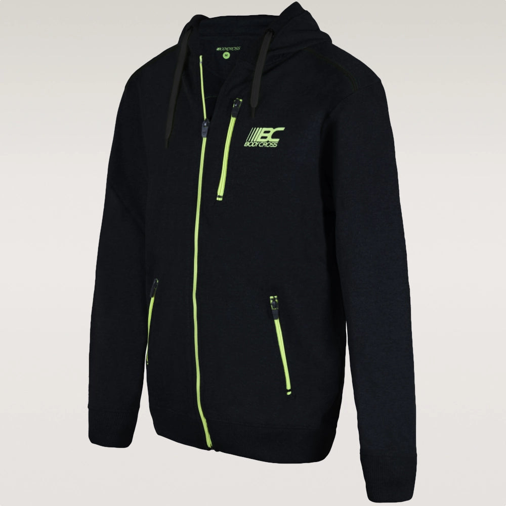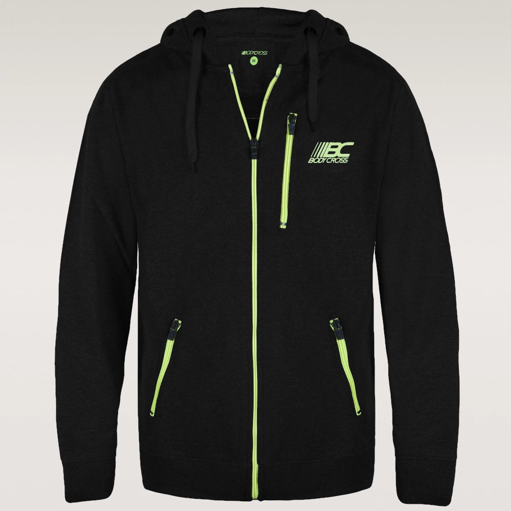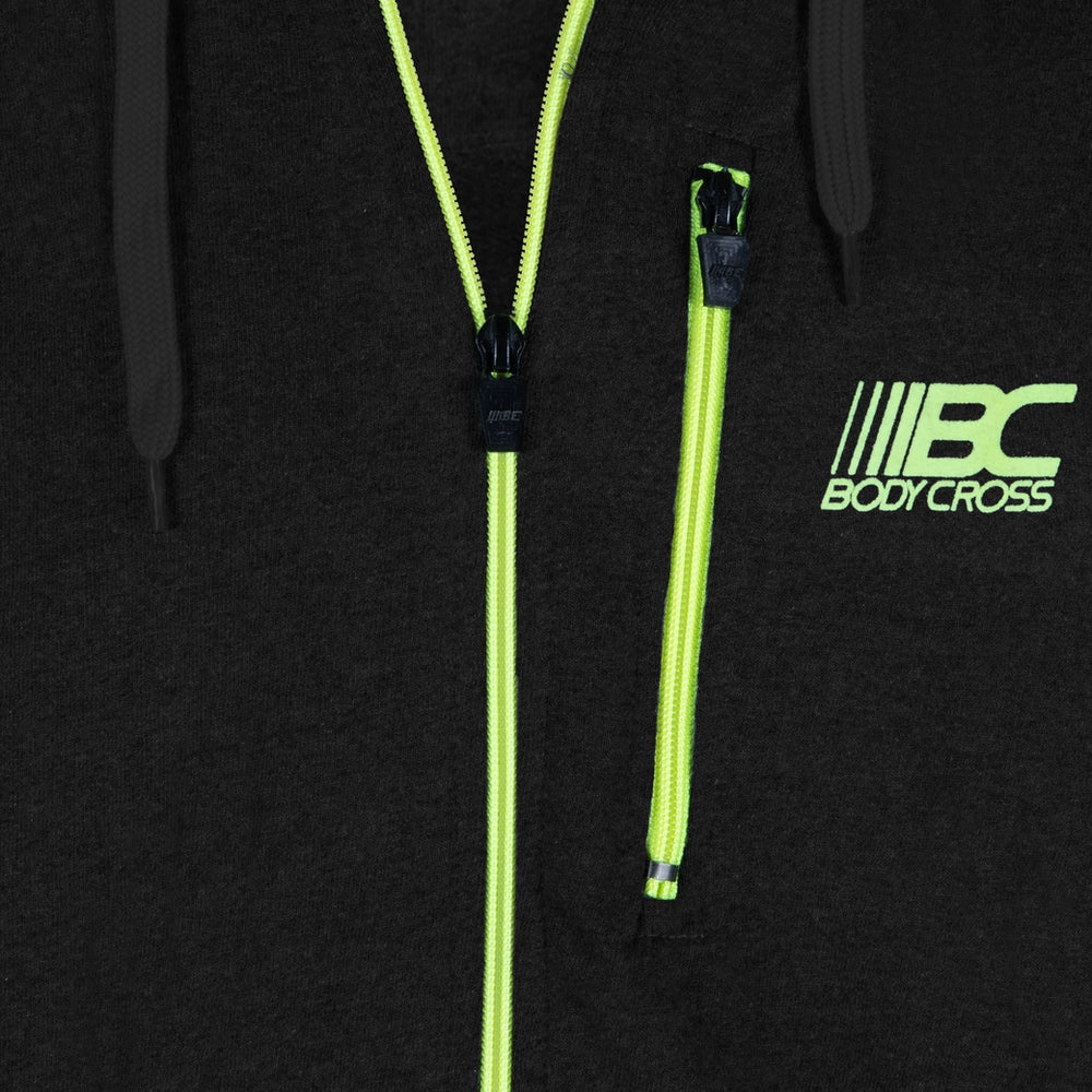 Die Reißverschlüsse, Pipings und Logos sind in Neongelb gehalten, um einen kontrastierenden Effekt zu erzielen.