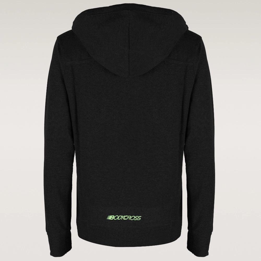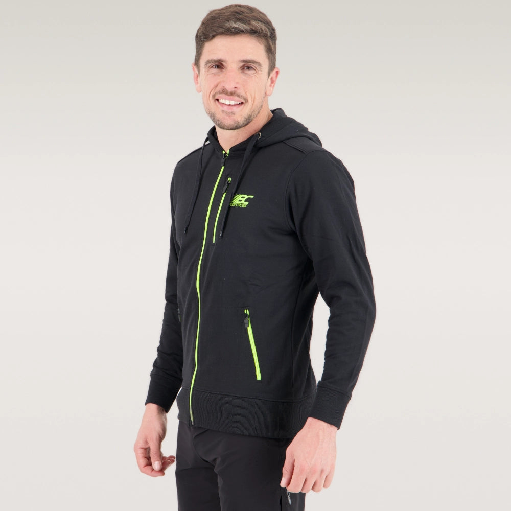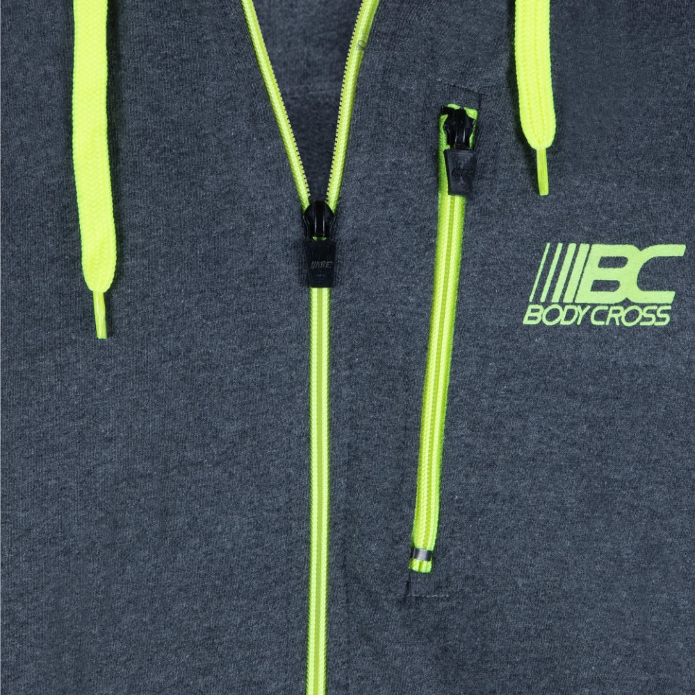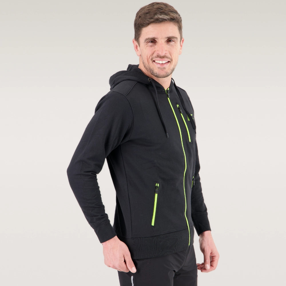 Die Reißverschlüsse, Pipings und Logos sind in Neongelb gehalten, um einen kontrastierenden Effekt zu erzielen.