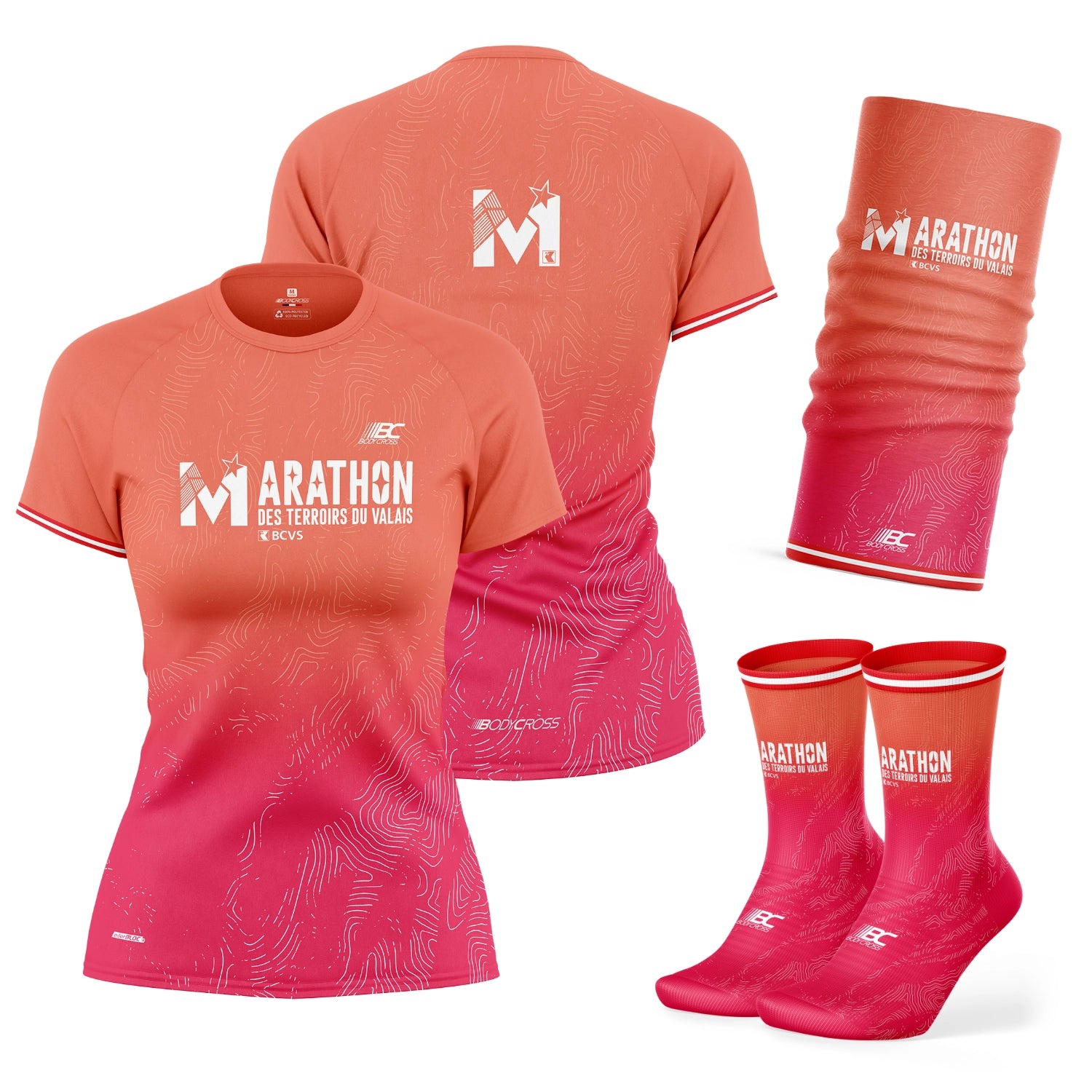 Celebrate the 2026 edition of the Valais Terroirs Marathon (BVCS) in Martigny, Switzerland with our collector's collection: T-shirt, neck warmer, and socks, designed to combine performance, comfort, and eco-responsible commitment.