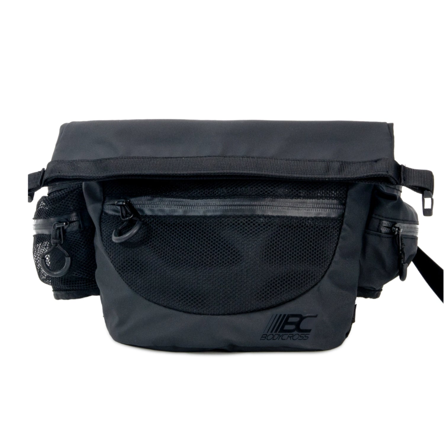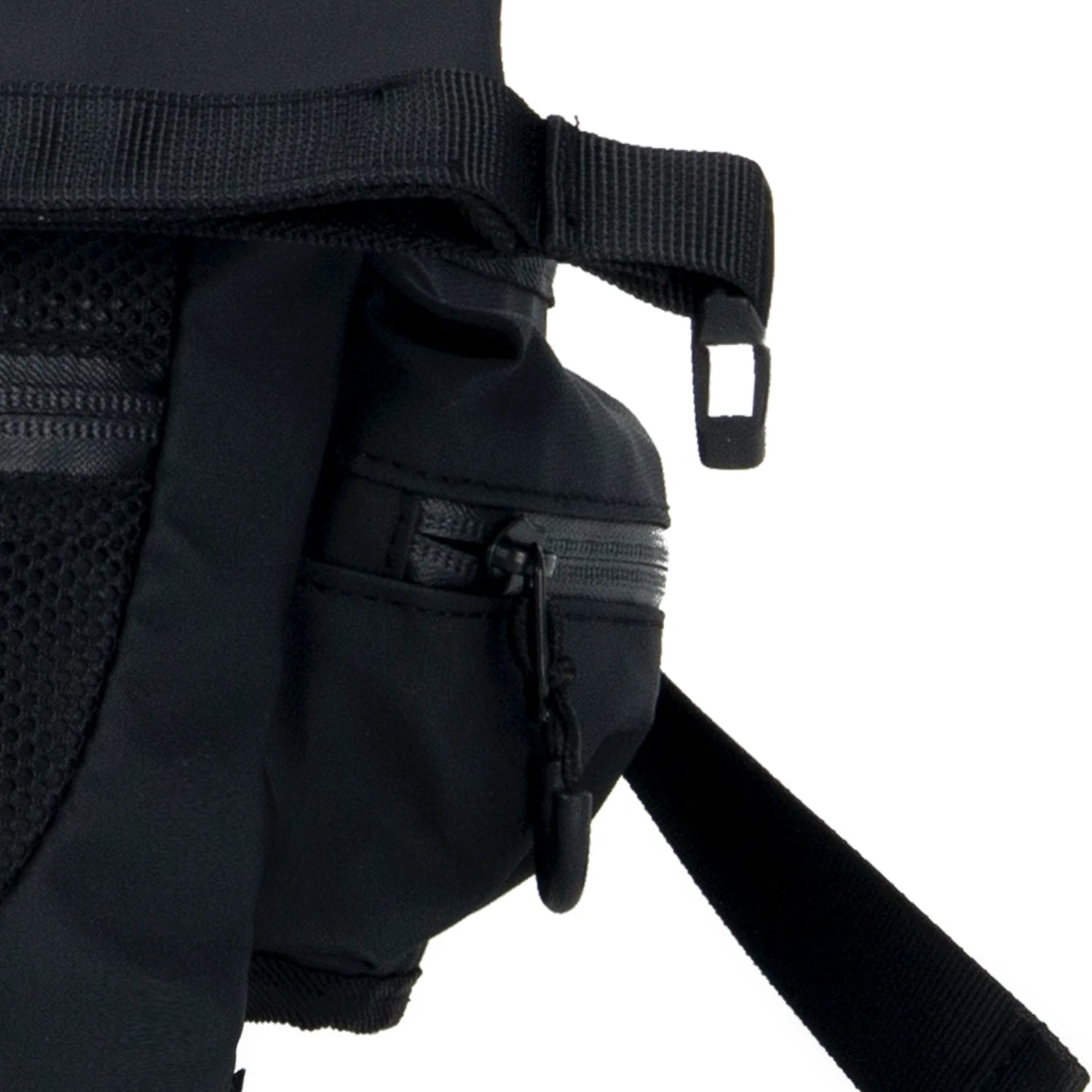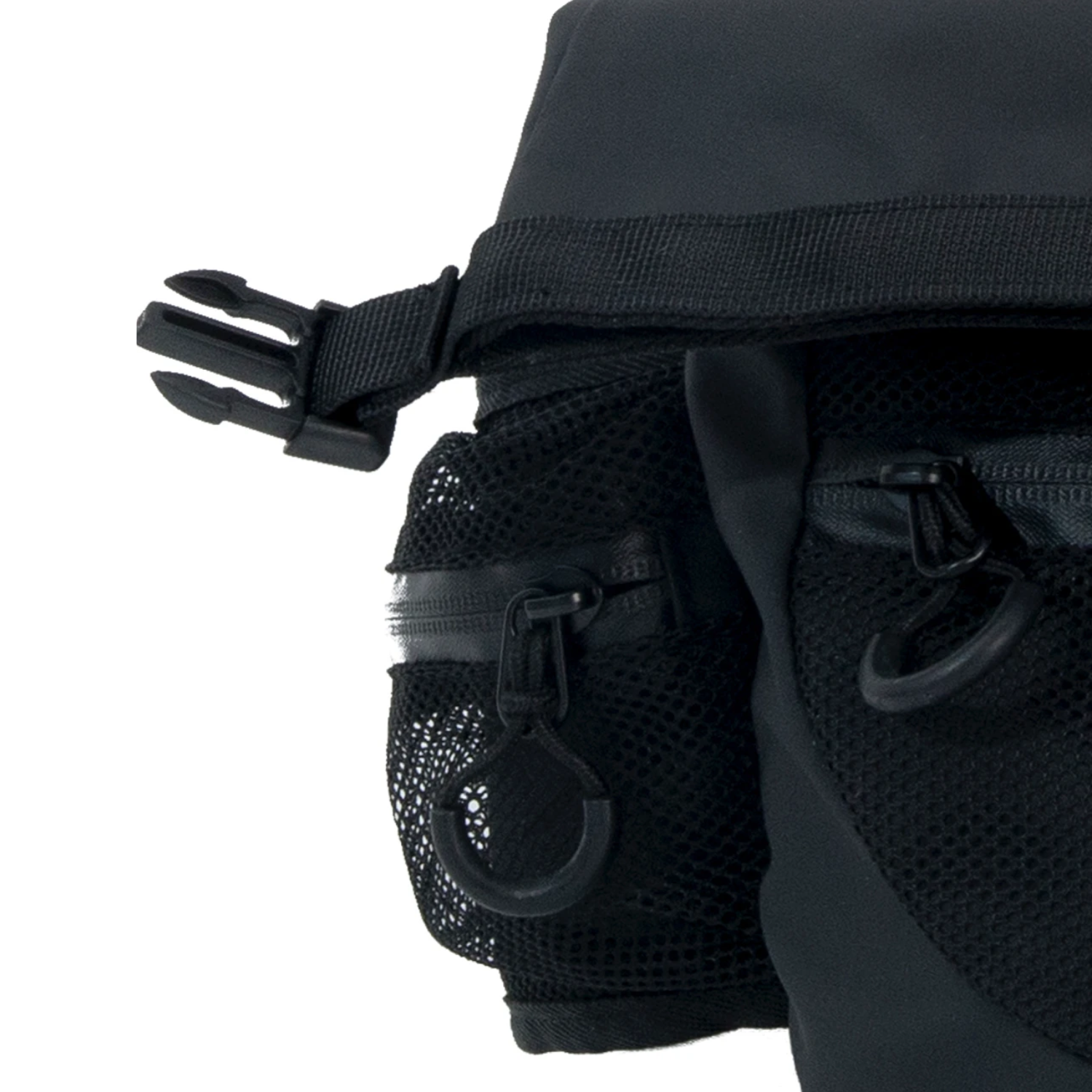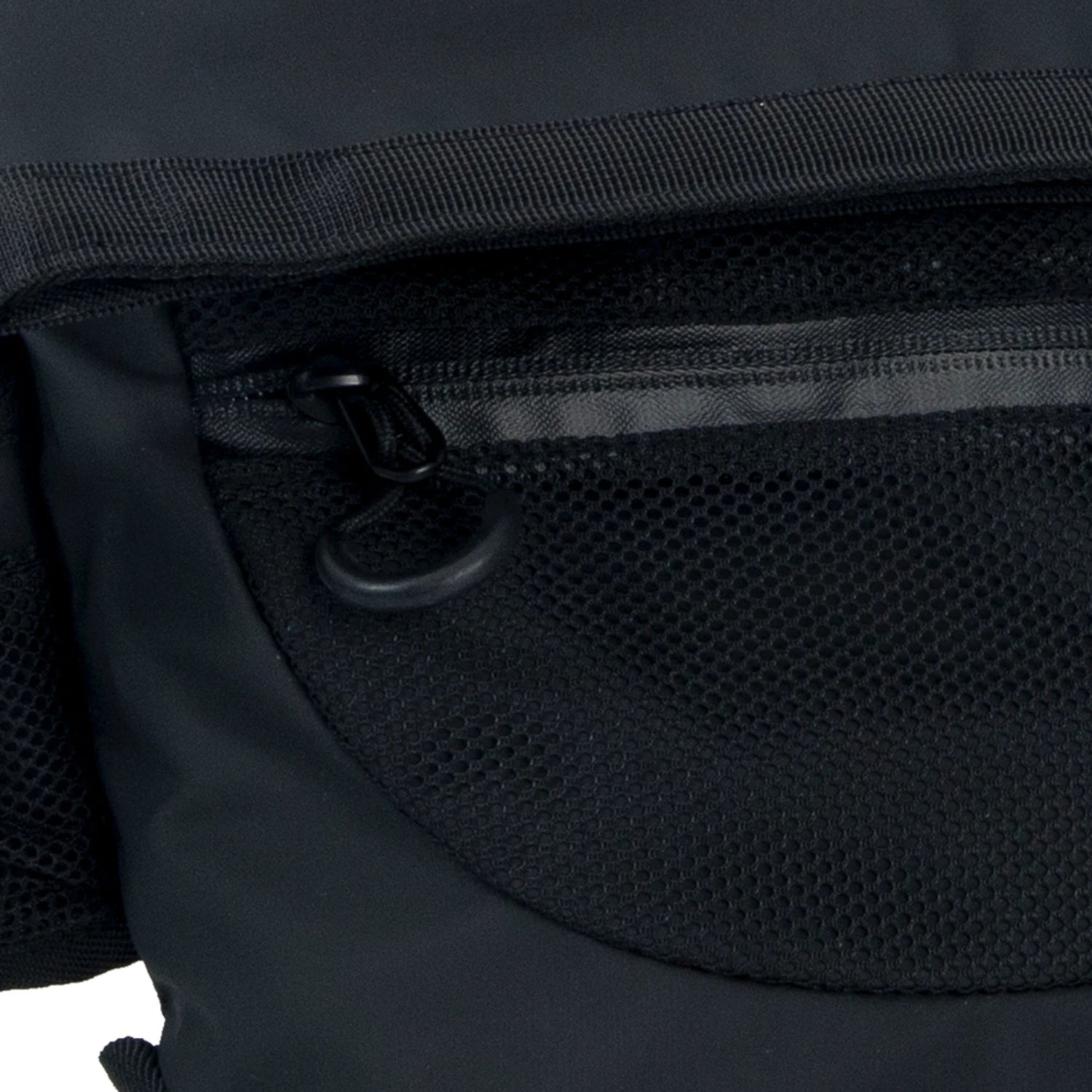 L'intérieur du sac est composé d'une poche pour y glisser vos objets précieux. A l'extérieur, de chaque côté de la poche centrale, 1 poche avec zip waterproof et 1 poche en mesh y sont attachés.