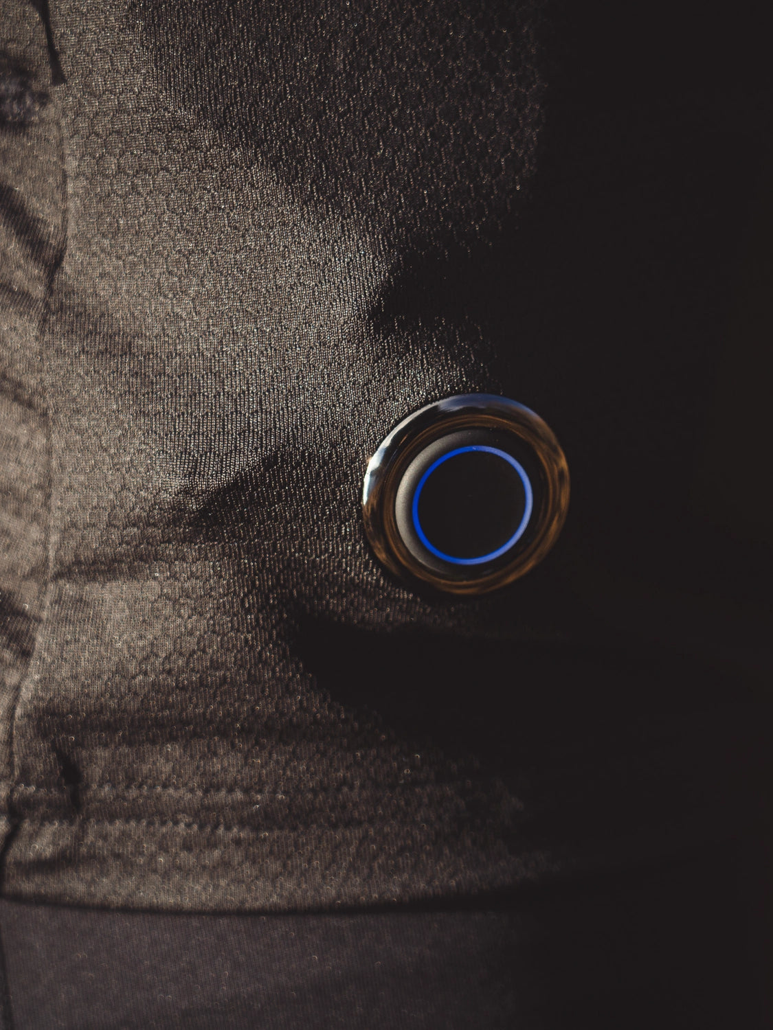 - La fonction chauffante s'active par l'intermédiaire d'un bouton positionné sur le bas du T-shirt à droite qui permet d'activer l'ensemble des résistances avant et dos.